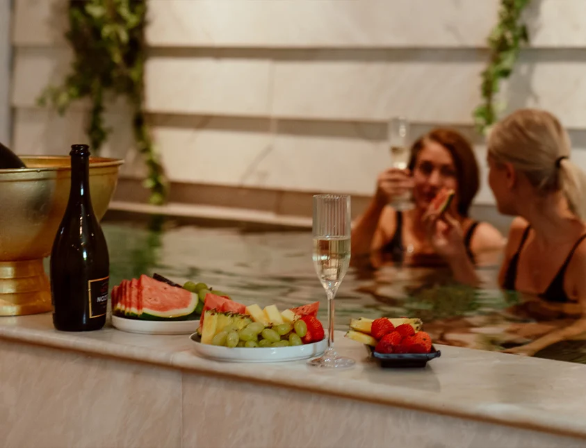 Sittandes på marmorbänken utför du en inledande uppmjukning av fötterna – ett fotbad som spetsas med de finaste salterna.